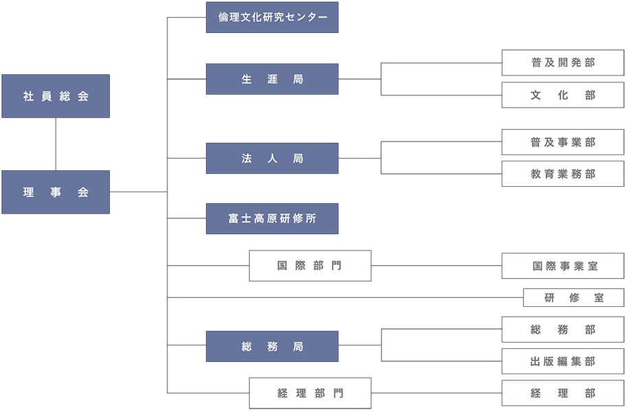 | 目的 | 倫理の研究並びに実践・普及により、生活の改善、道義の昂揚、文化の発展を図り、もって民族の繁栄と人類の平和に資することを目的としています。 |