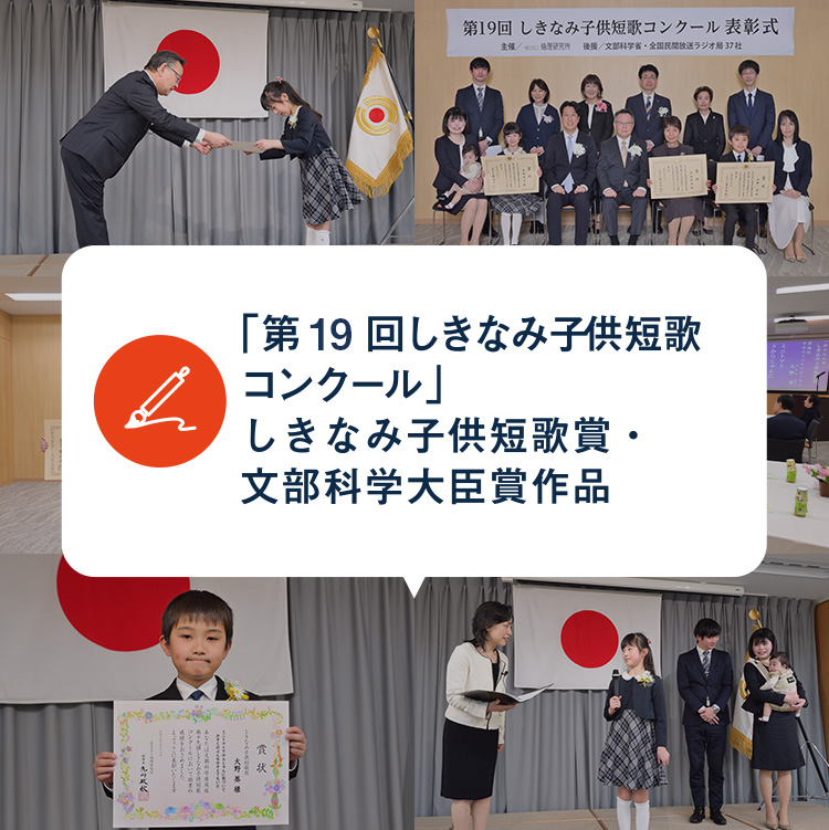 「第20回しきなみ子供短歌コンクール」には、全国の小学生58,514名(1,188校)より短歌が寄せられ、3次にわたる厳正なる選考の結果、しきなみ子供短歌賞・文部科学大臣賞3名、特選20名、入選289名、佳作480名が決定しました。令和7年2月16日、初めて紀尾井清堂で表彰式を開催。式には「しきなみ子供短歌賞」「文部科学大臣賞」の受賞者とその家族が来場しました。